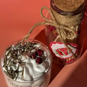 Our massage foam candle contains essential nourishing and moisturising oils that help soothe the skin and enhance the quality of sleep. Perfect for when you’re looking to create a relaxing moment and de-stress, either for you or a loved one. Our selection of relaxing scents bring you a heightened fragrance experience that helps you to fall asleep faster and wake up more refreshed. Each candle is decorated with dried roses and other dried add-ons making it not only a beautiful decorative piece for your home but also a thoughtful gift idea for loved ones. We recommend to remove these decorations before lighting the candle to ensure a safe burn.